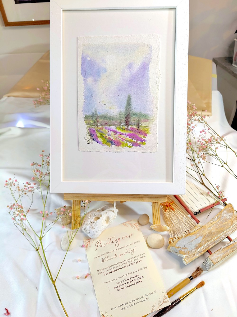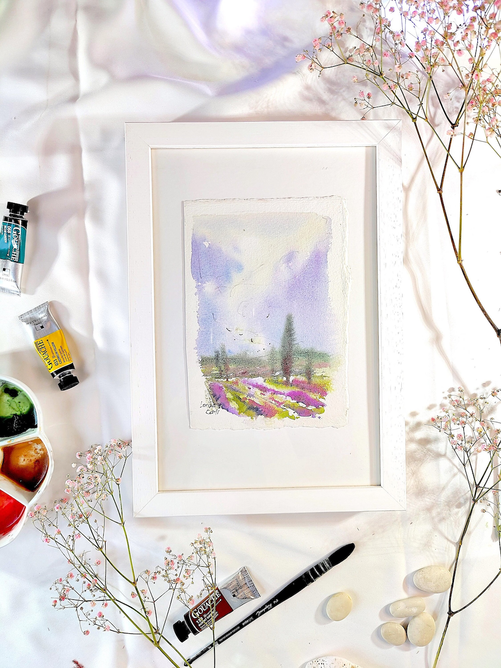 A small and beautiful original watercolor painting of lavender fields ❤️