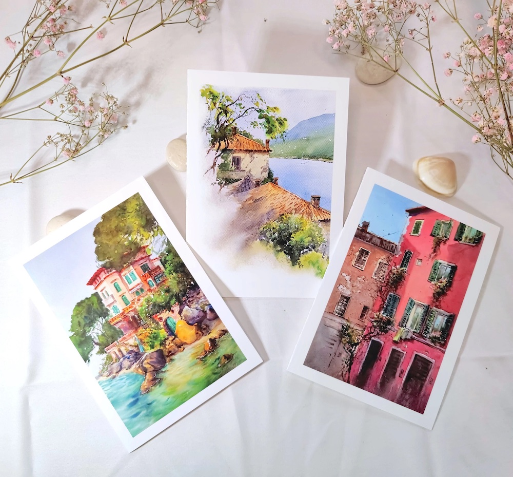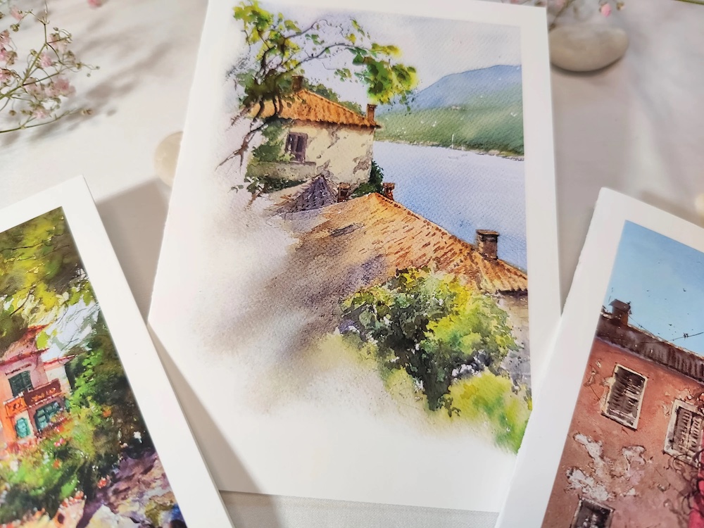 A set of three greeting card prints of Istria beautiful coastal towns Moščenička draga, Rabac and Rovinj.