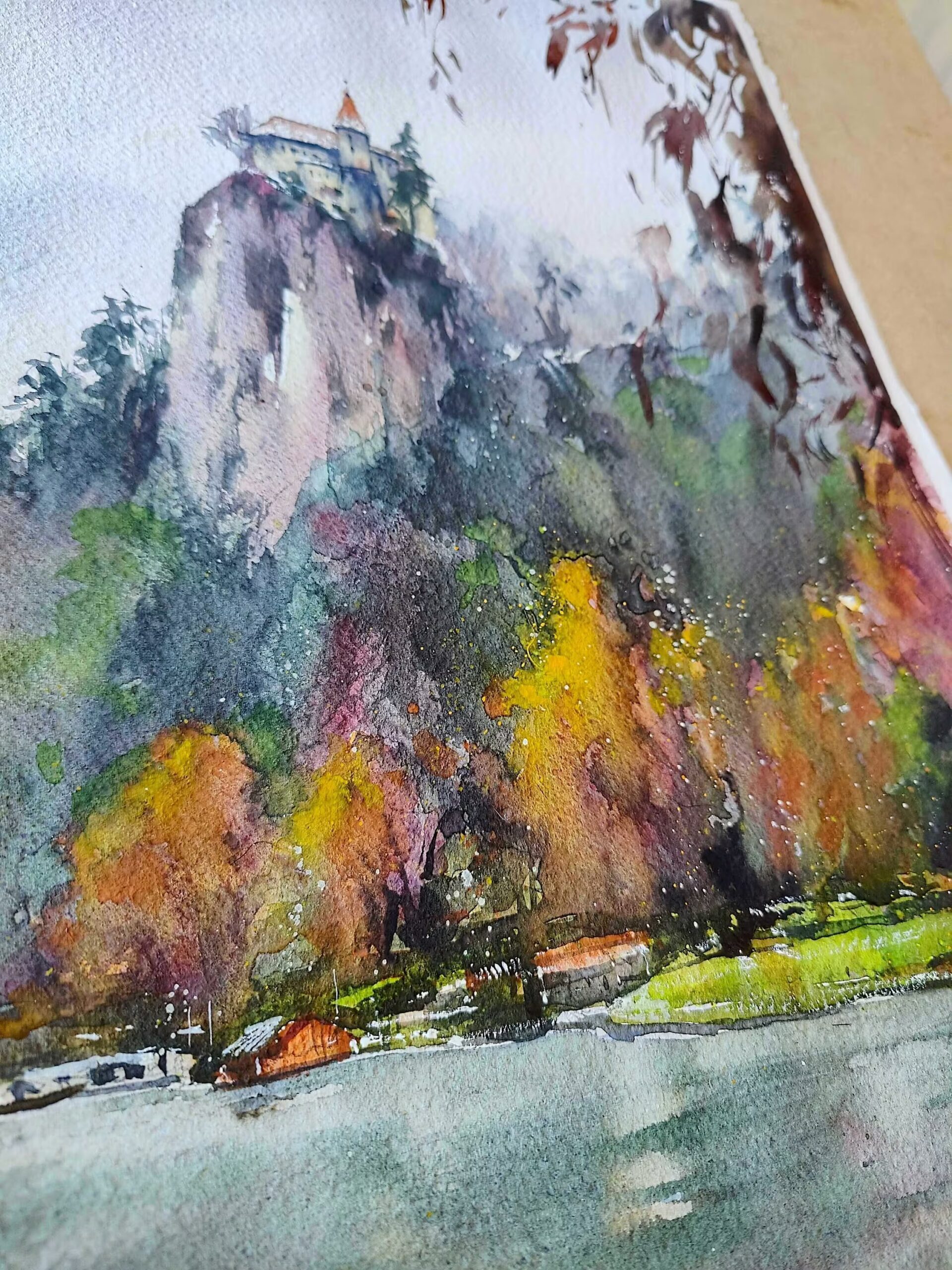 Lake Bled watercolor original painting. Bled Lake is Slovenia’s most iconic tourist destination, with its famous landmarks the lake’s island, and Bled castle. This painting beautifully showcases both of them!