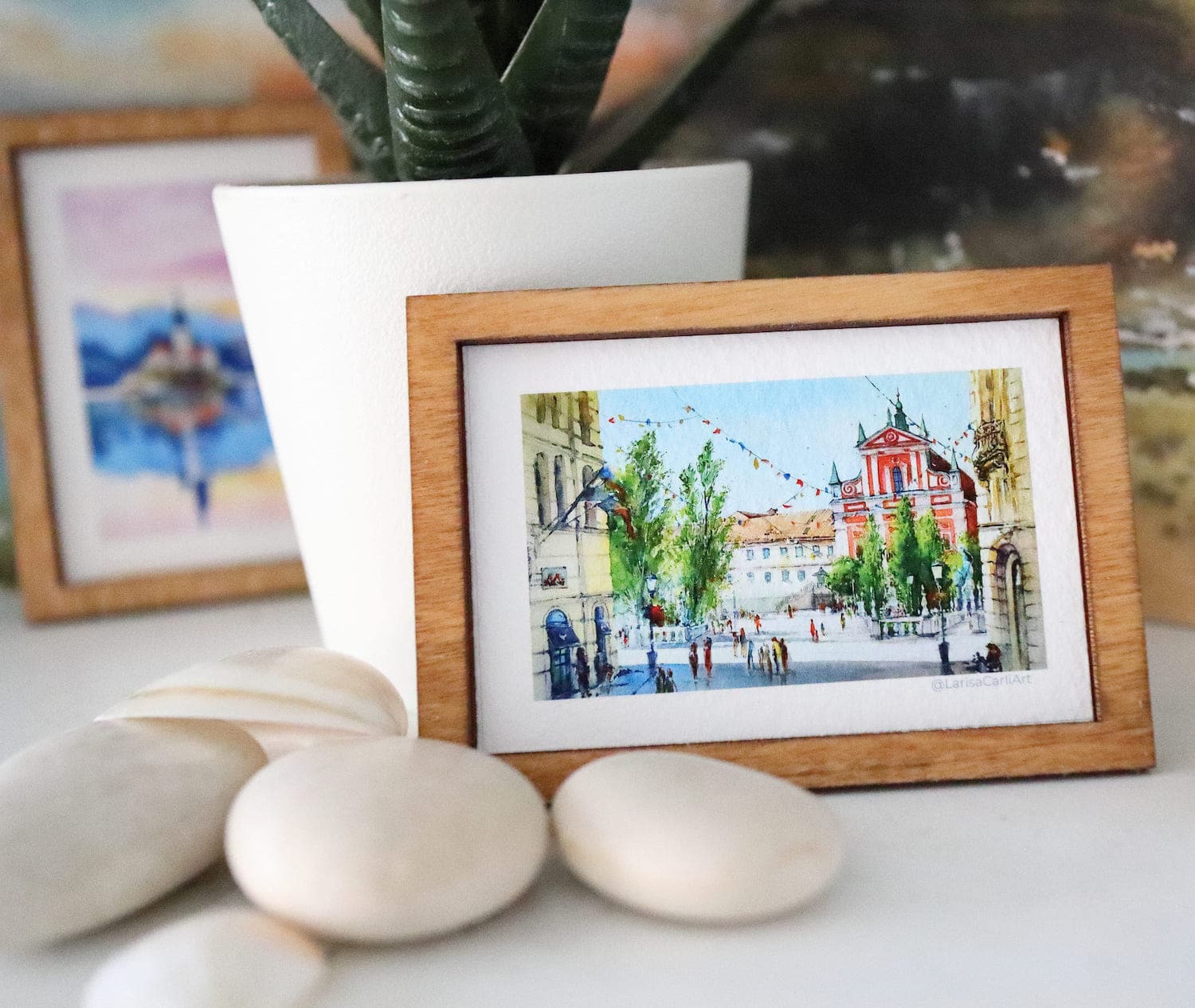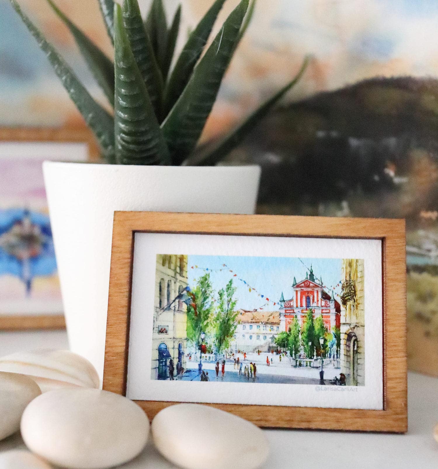 A mini framed painting of Slovenia’s capital, Ljubljana’s beautiful Prešeren square. These wooden framed paintings are actually magnets! They can be used either as shelf decor, or beautiful art magnets.