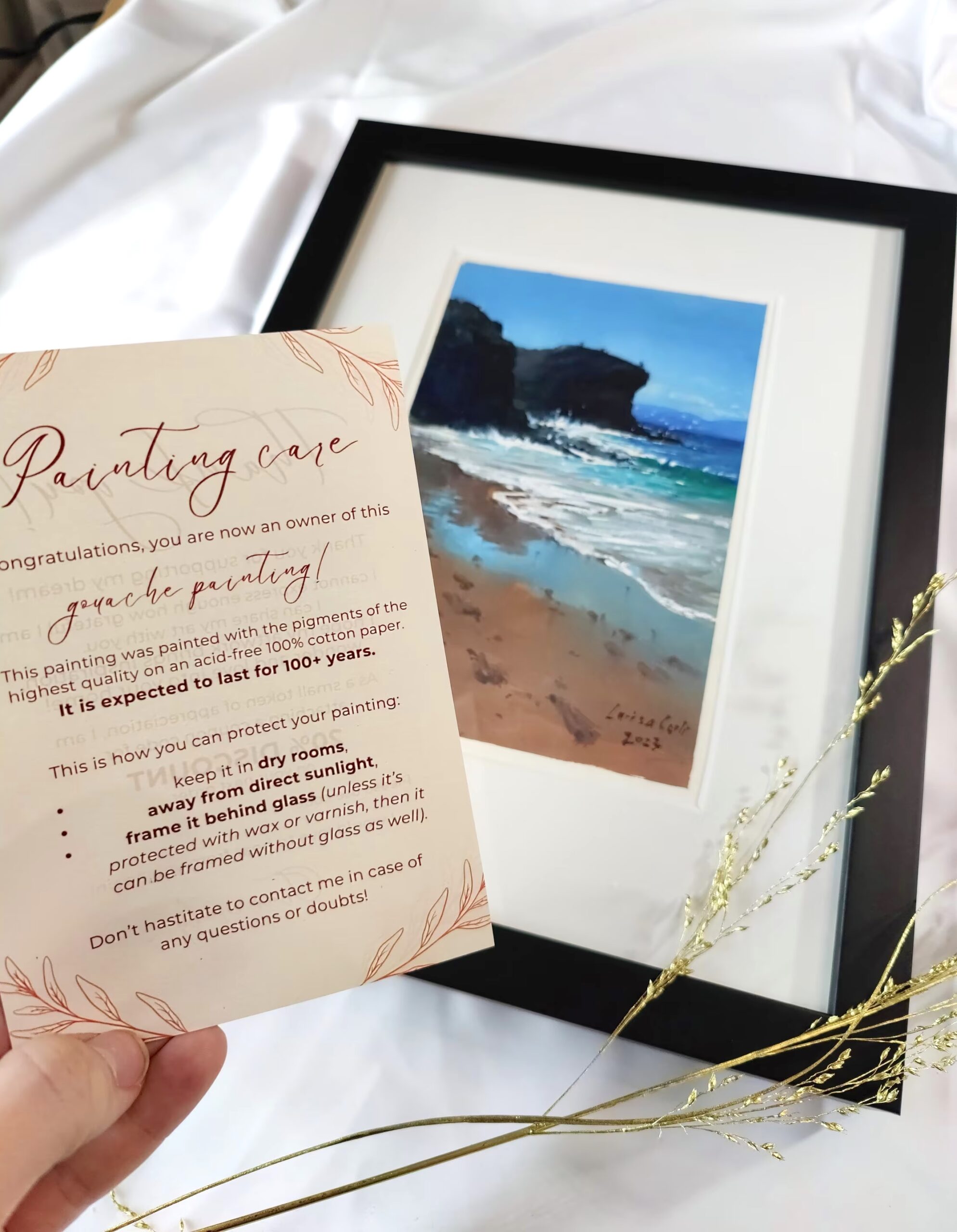 Paintings are wrapped in bubble wrap and sealed against moisture. Artworks up to A3 size arrive flat, and the larger ones arrive rolled and safely packaged in a triangular box.