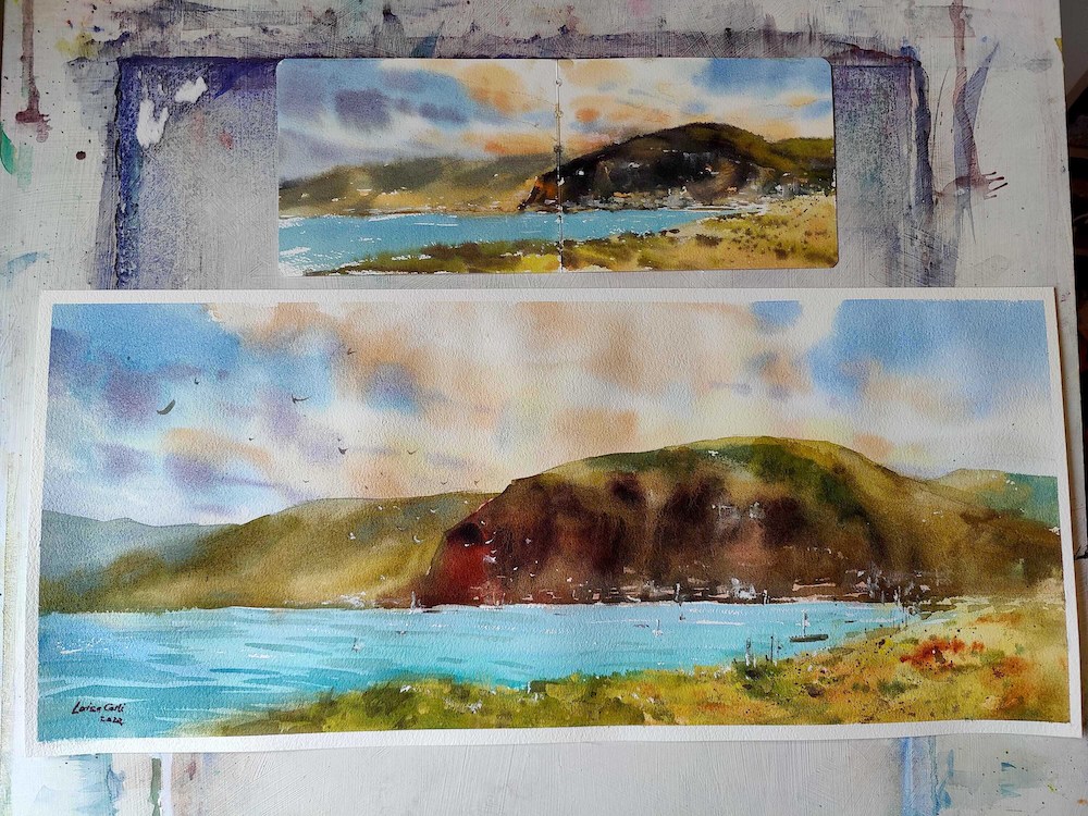I painted this panoramic painting of Troia penisula after a smaller one I did on location on a beautiful morning, and was surprised by the gentle sunrise colors that lasted just enough time for me to capture them on paper. Troia penisula lays in Portugal, close to Lisbon.