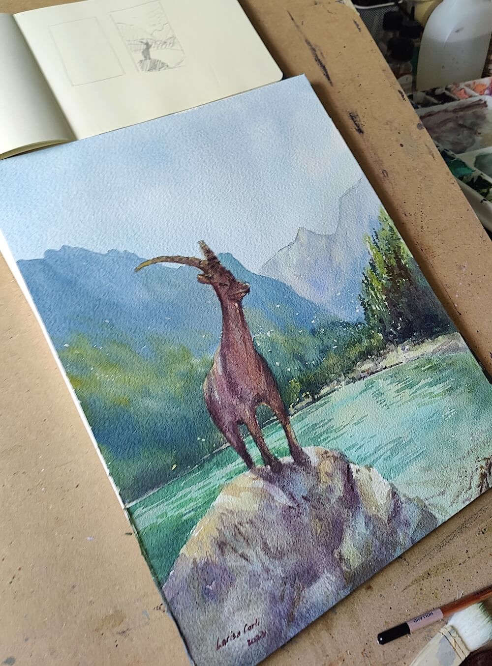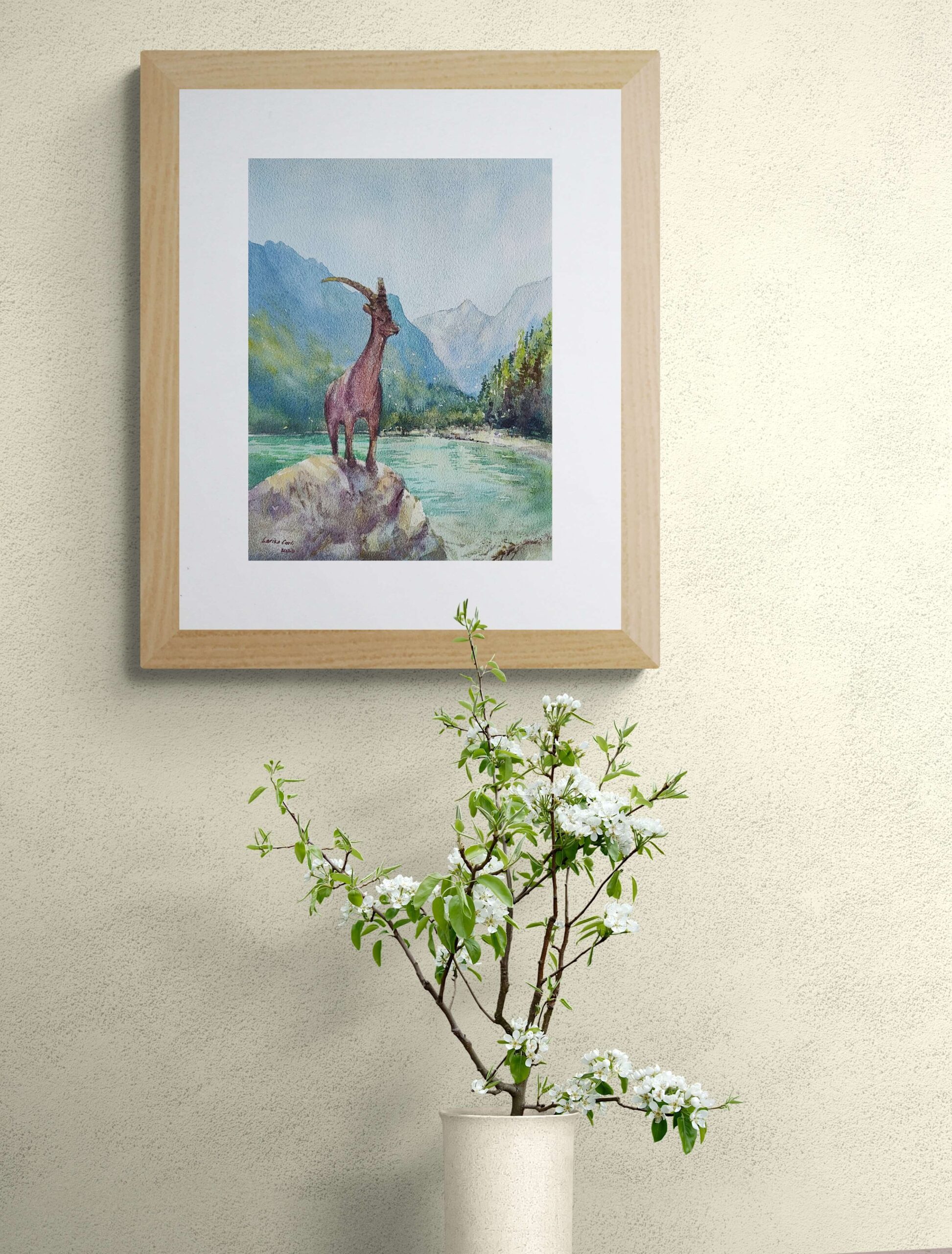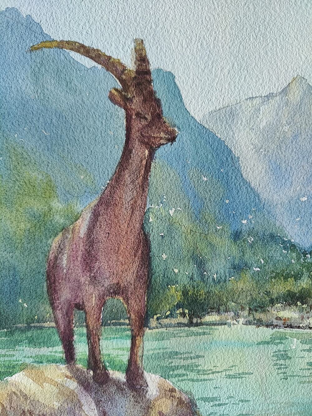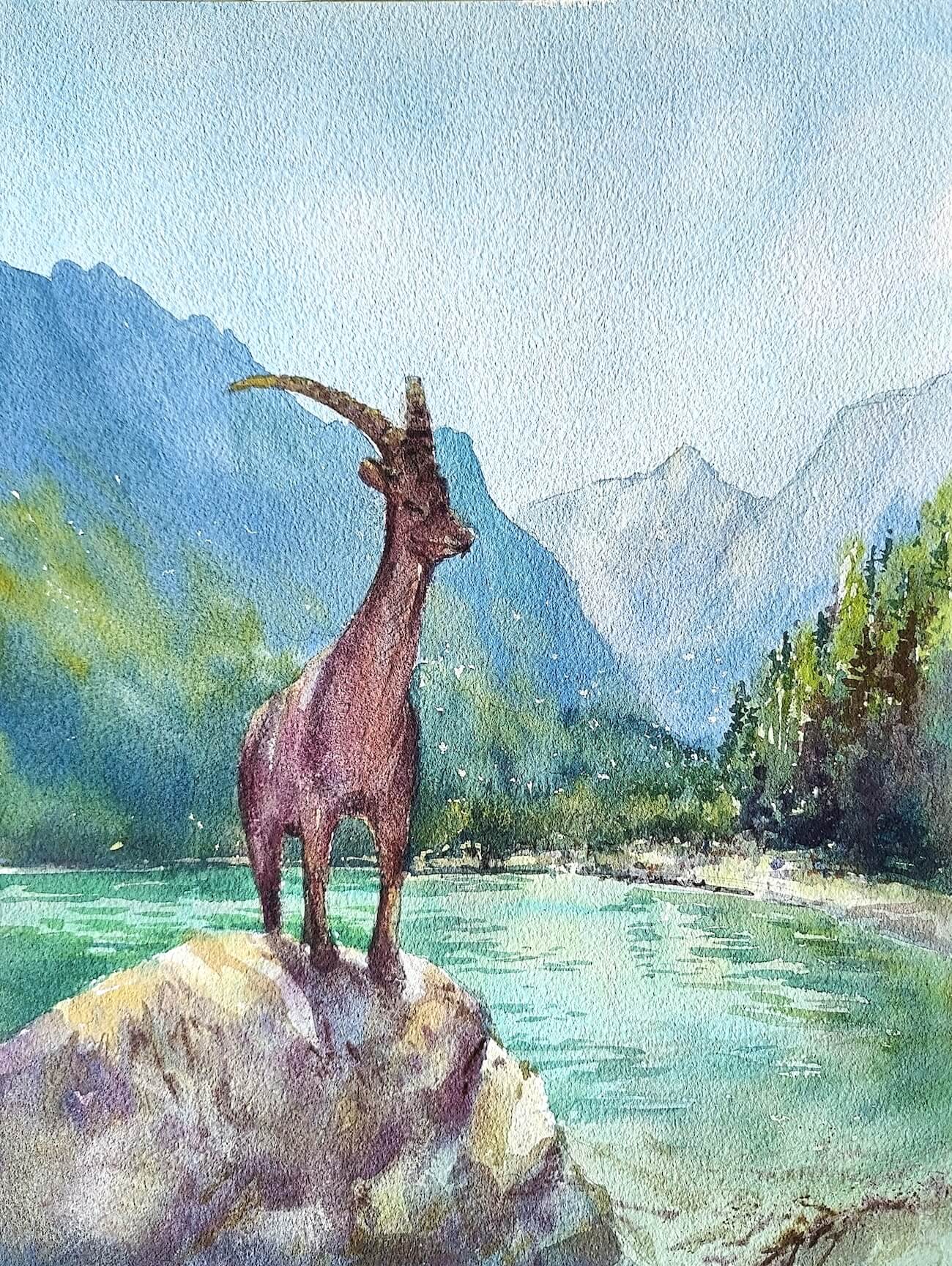 Jezero Jasna Skulptura Kozorog, Slovenija originalna akvarelna slika