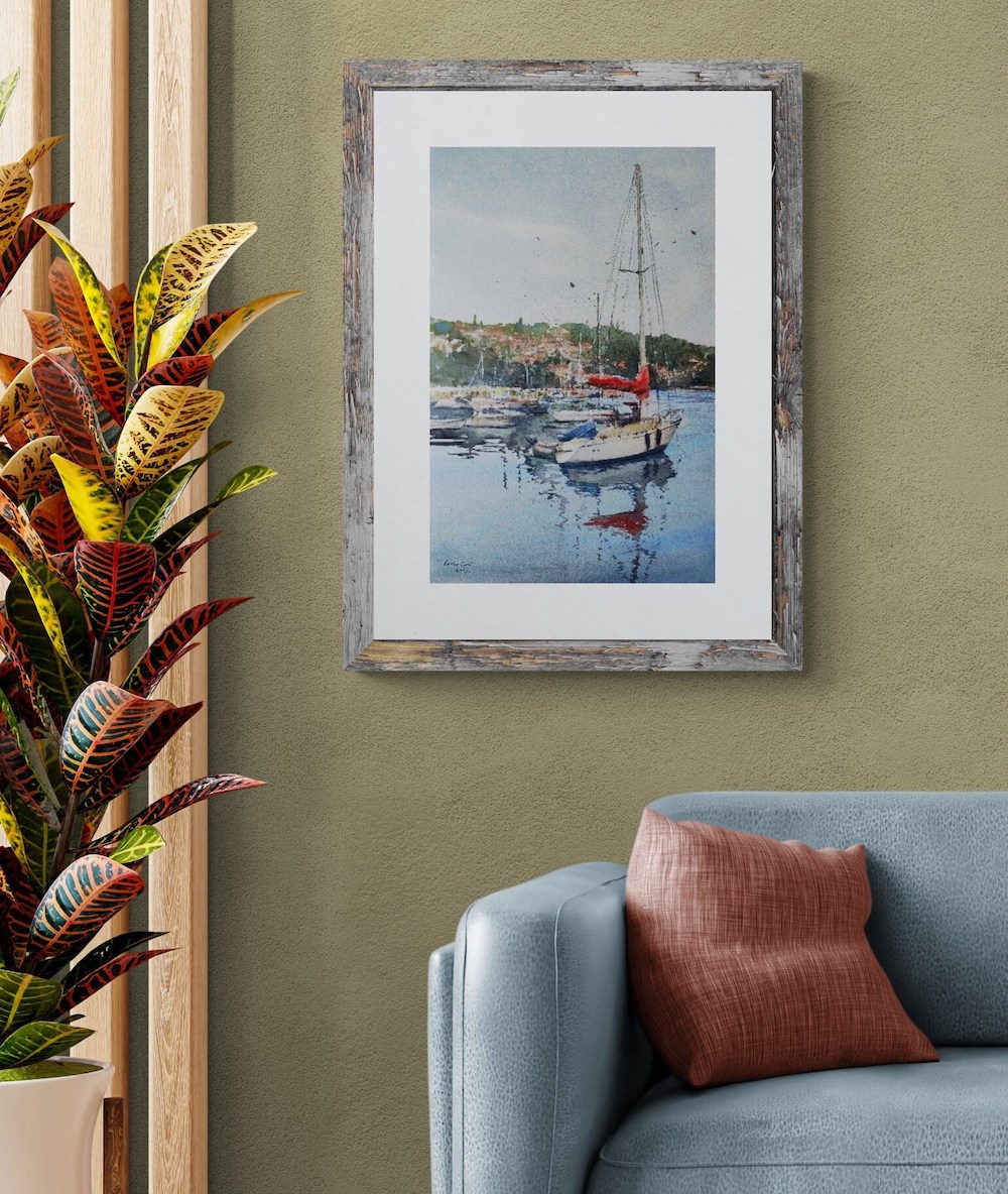 Ta akvarelna slika prikazuje jadrnico v Opatiji, pristanišču v Istri. Opatija je eno najlepših hrvaških obalnih mest, predvsem s svojo bogato zgodovino in dih jemajočo arhitekturo.